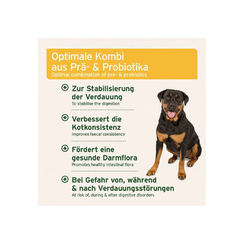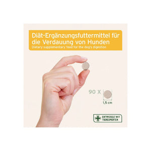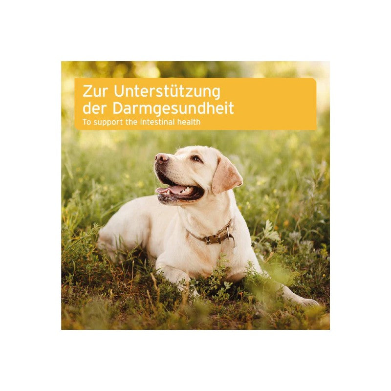 ... A healthy gut is the basis for a healthy animal! In a healthy intestinal flora, all natural intestinal bacteria are in balance - nasty germs cannot spread. Sometimes, however, this balance gets out of whack: worming treatments, antibiotics or diarrhea can cause quite a mess in your four-legged friend's intestines! Intestinal Plus tablets contain the probiotic bacterium Enterococcus faecium, yeast and prebiotic fiber. Short-chain fatty acids are formed from the prebiotic fibres, which stimulate intestinal activity and thus optimize digestion. The probiotic bacteria support the development of healthy intestinal flora.
