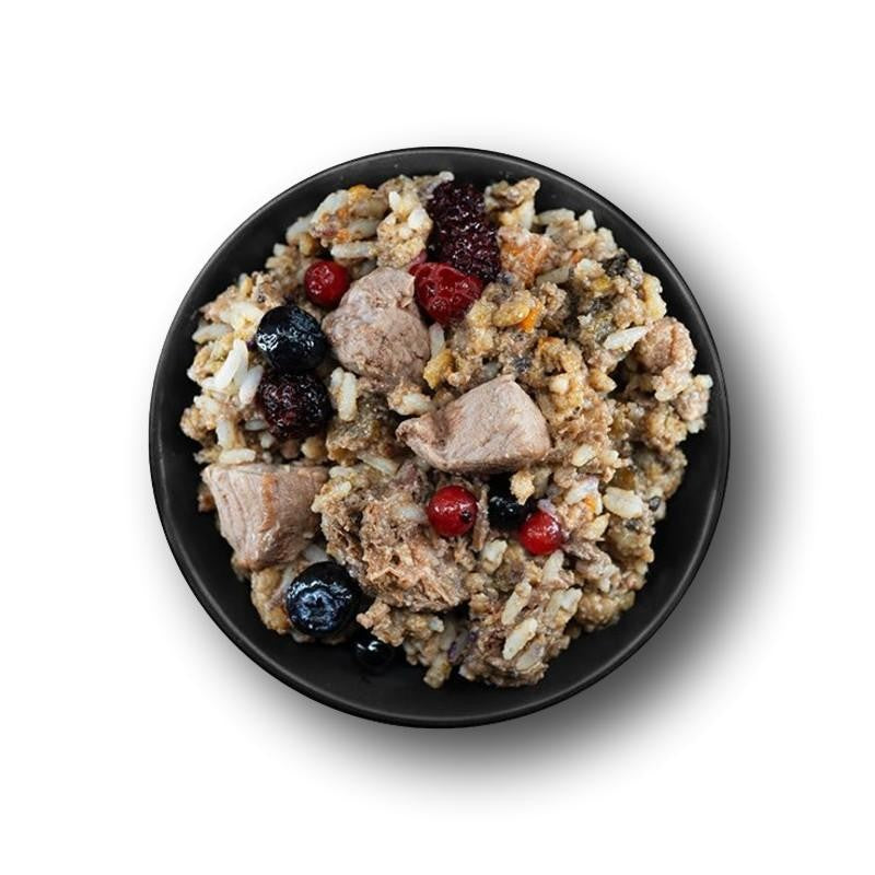 Horse 65% (heart, meat, liver), broth 27.5%, sweet potatoes 4%, carrots 2%, minerals 1%, safflower oil 0.3%, herbal mixture 0.1% (basil, chamomile, dandelion, parsley, rosemary), yucca extract 0.1%