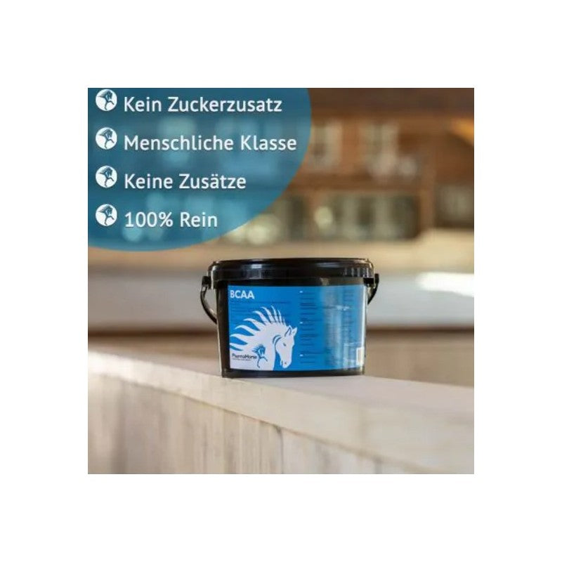 PharmaHorse BCAA in Pulverform enthält drei essentielle verzweigtkettige Aminosäuren: L-Leucin, L-Isoleucin und L-Valin. Die Abkürzung BCAA steht für Branched Chain Amino Acids.